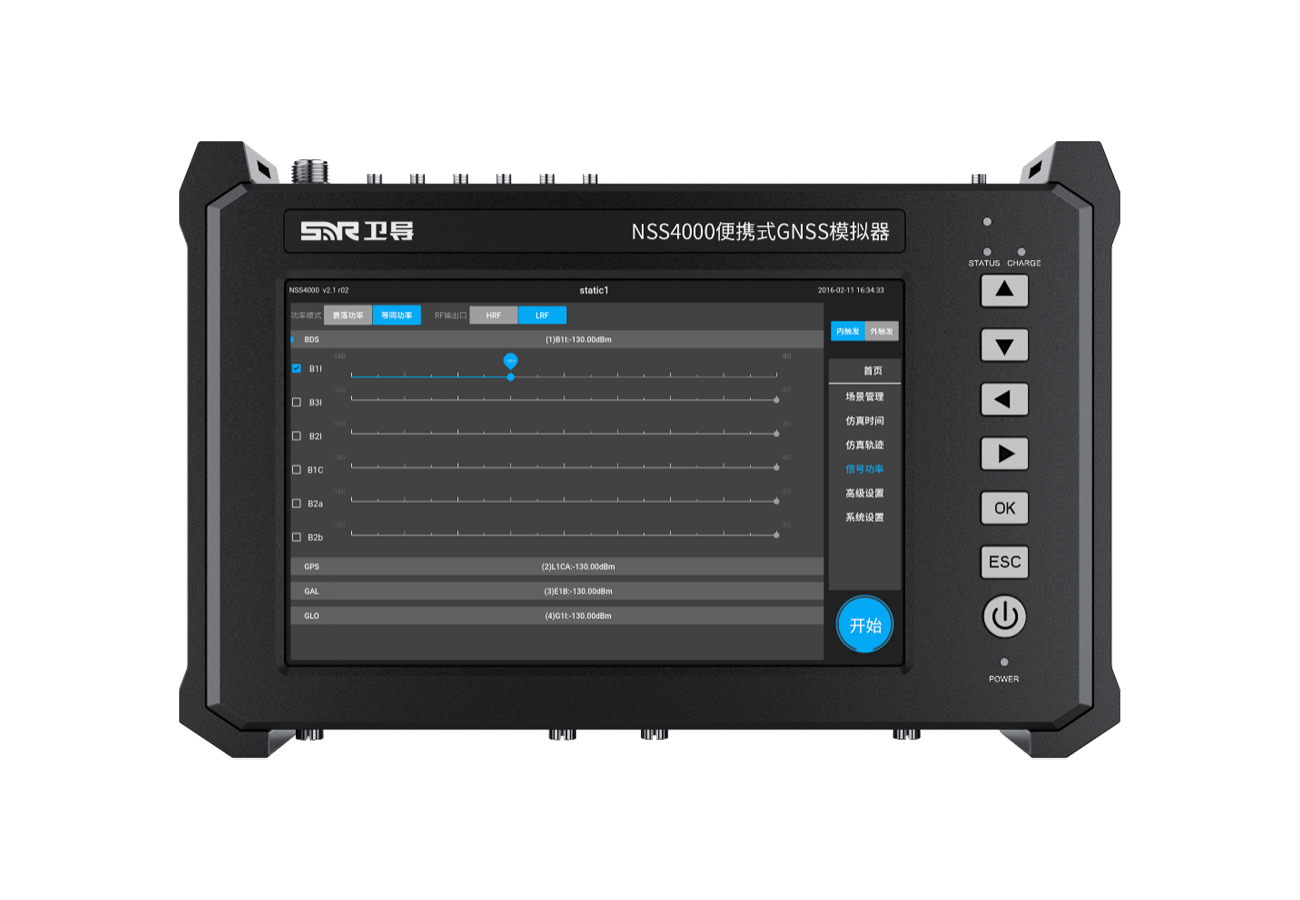 便携式卫星导航模拟器采用强大的计算平台和可重构可配置的体系架构设计,能够灵活配置同时输出不同系统导航频点信号,支持四系统全频段导航卫星信号模拟。同时,设备内置高稳定时钟模块,可与实际卫星导航系统完全同步,能够实现外场环境下的真实卫星导航信号模拟,便于对外场北斗/GNSS导航终端进行检测与排故。