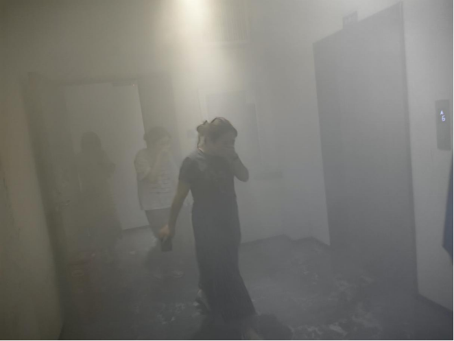 下午16时,演习正式开始。演习模拟办公场所因电线老化引发火灾,现场浓烟弥漫。消防警报拉响后,综合部立即启动预案组织员工快速疏散。